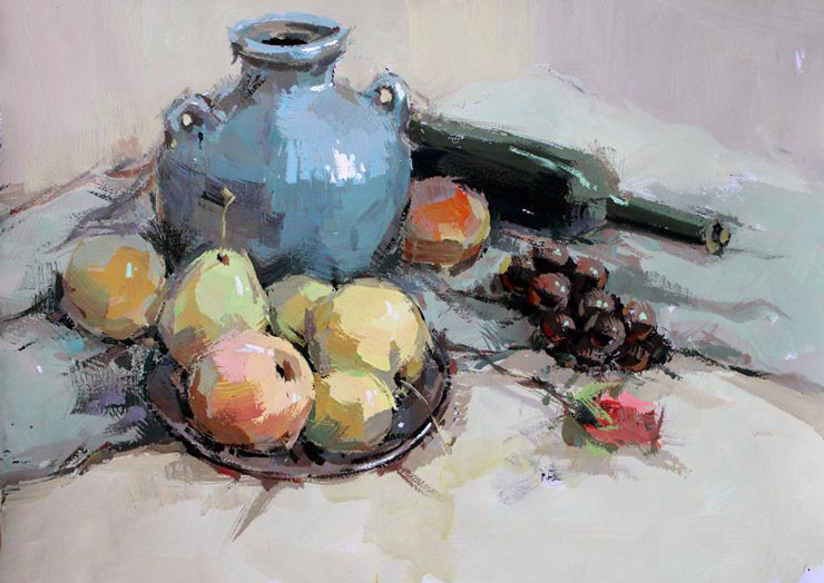 在此基础上,注意处理好物体固有色与环境色的关系,在丰富的前提下求统一,在统一中求变化,相互衬托,使整个画面的色彩能和谐共处